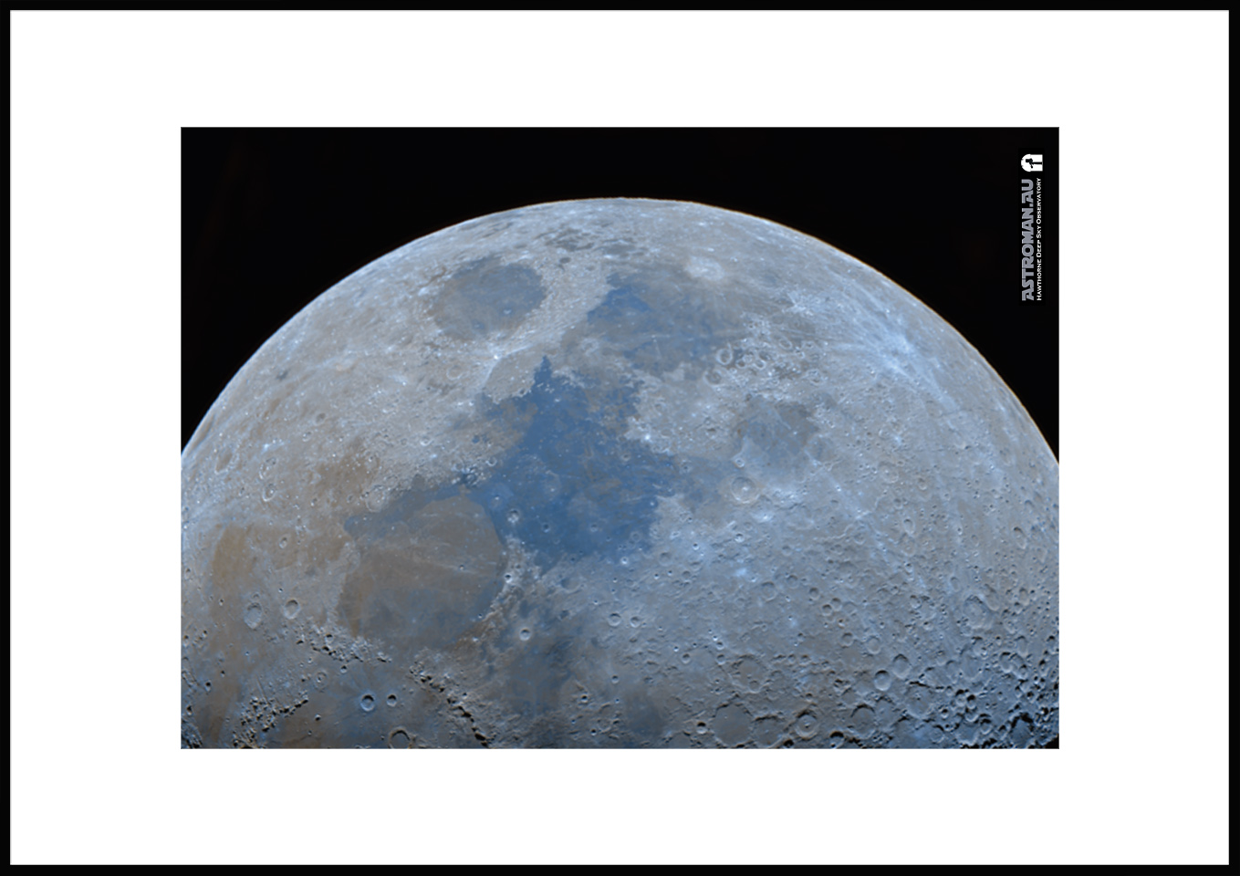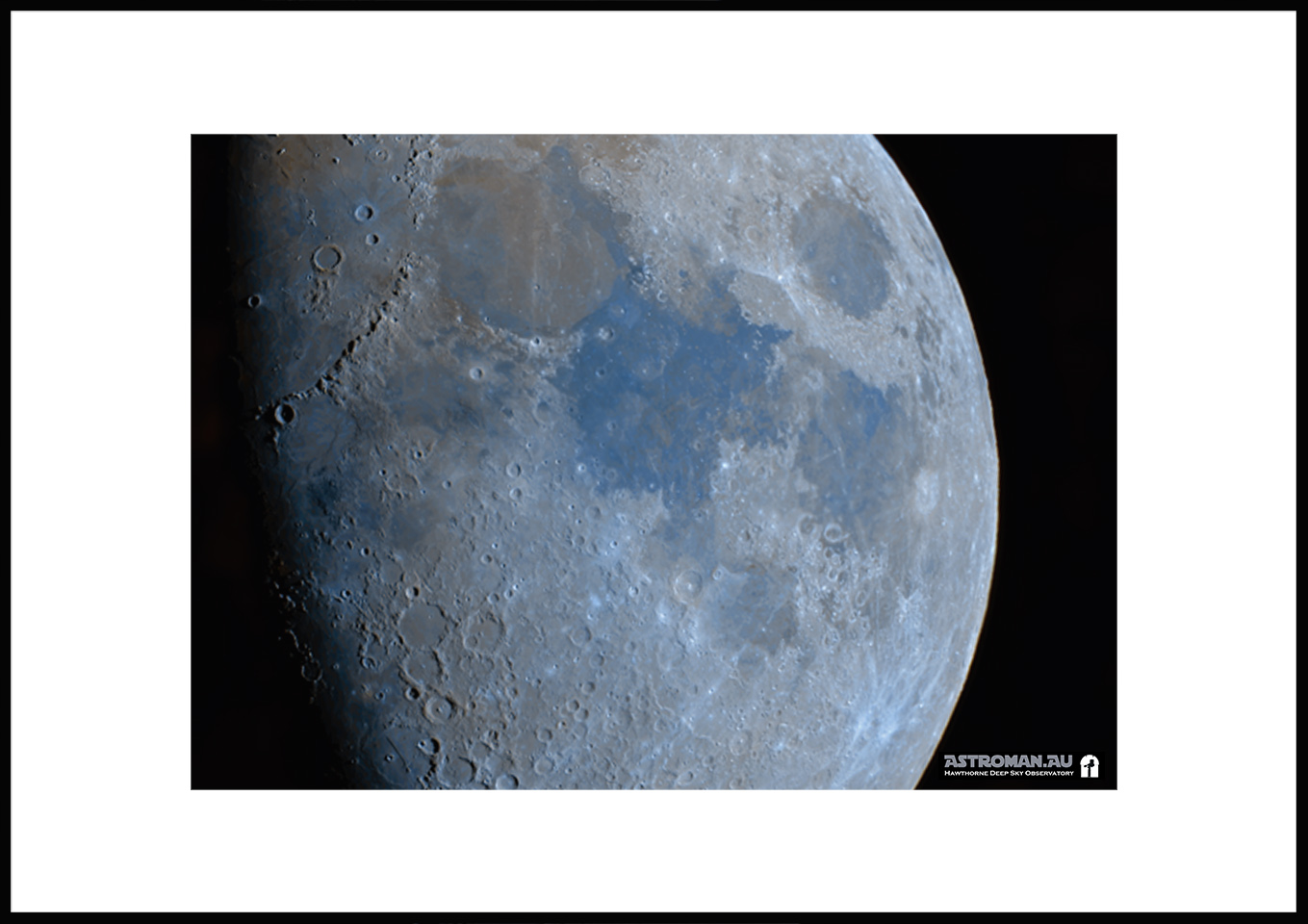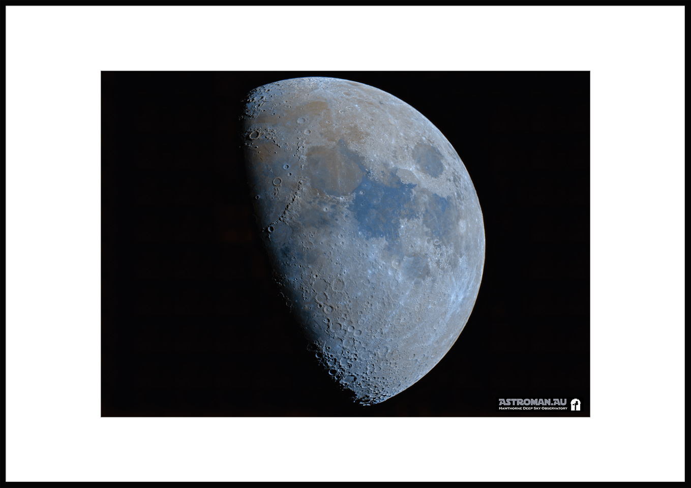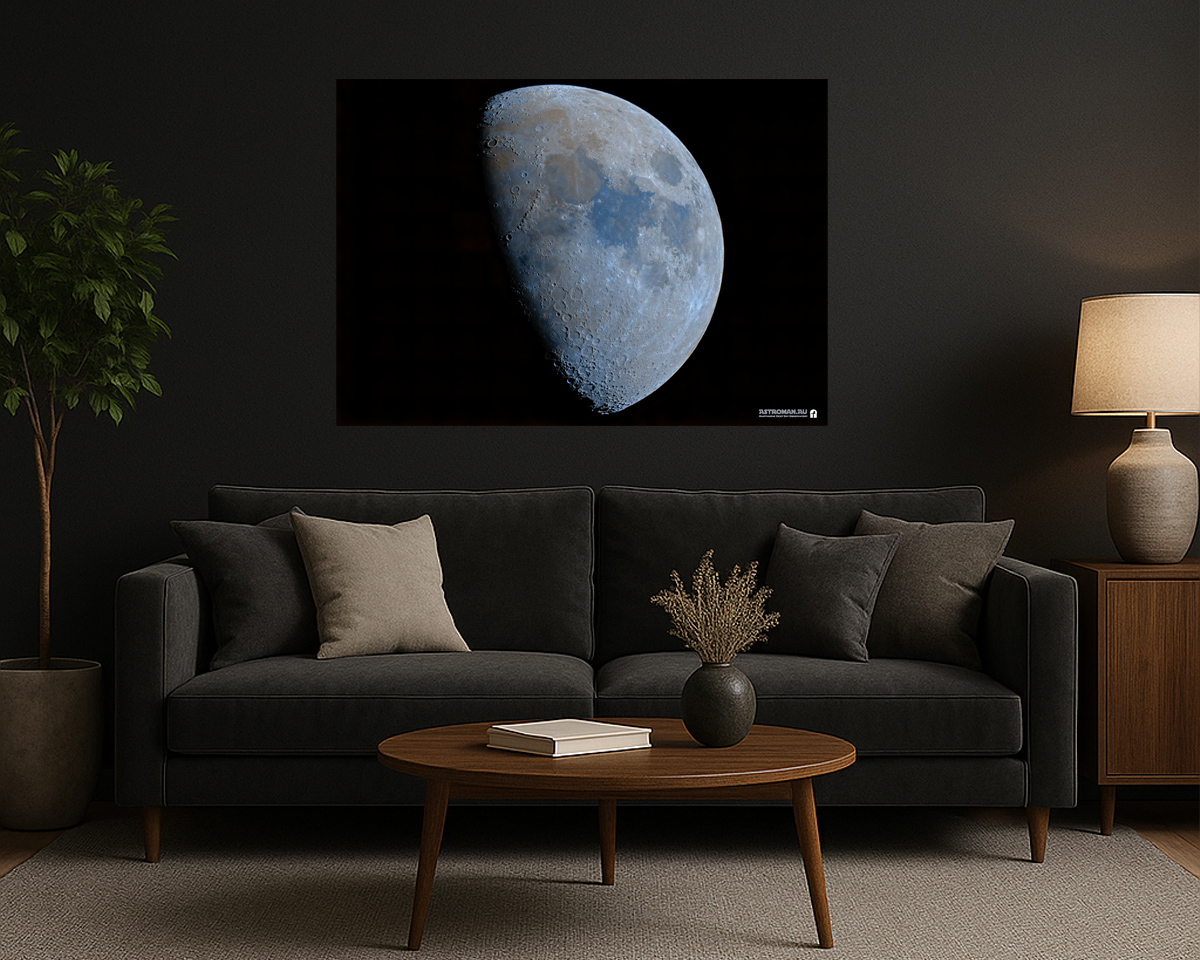 This refined astrophotograph captures the Moon at 66.6% illumination, revealing its rarely seen, naturally subtle colours. Though the lunar surface appears grey to the naked eye, high-resolution imaging and careful colour amplification bring out faint shades shaped by the Moonβs complex geology: soft oranges hinting at iron-rich basalt plains and muted blues indicating regions richer in titanium-bearing minerals.