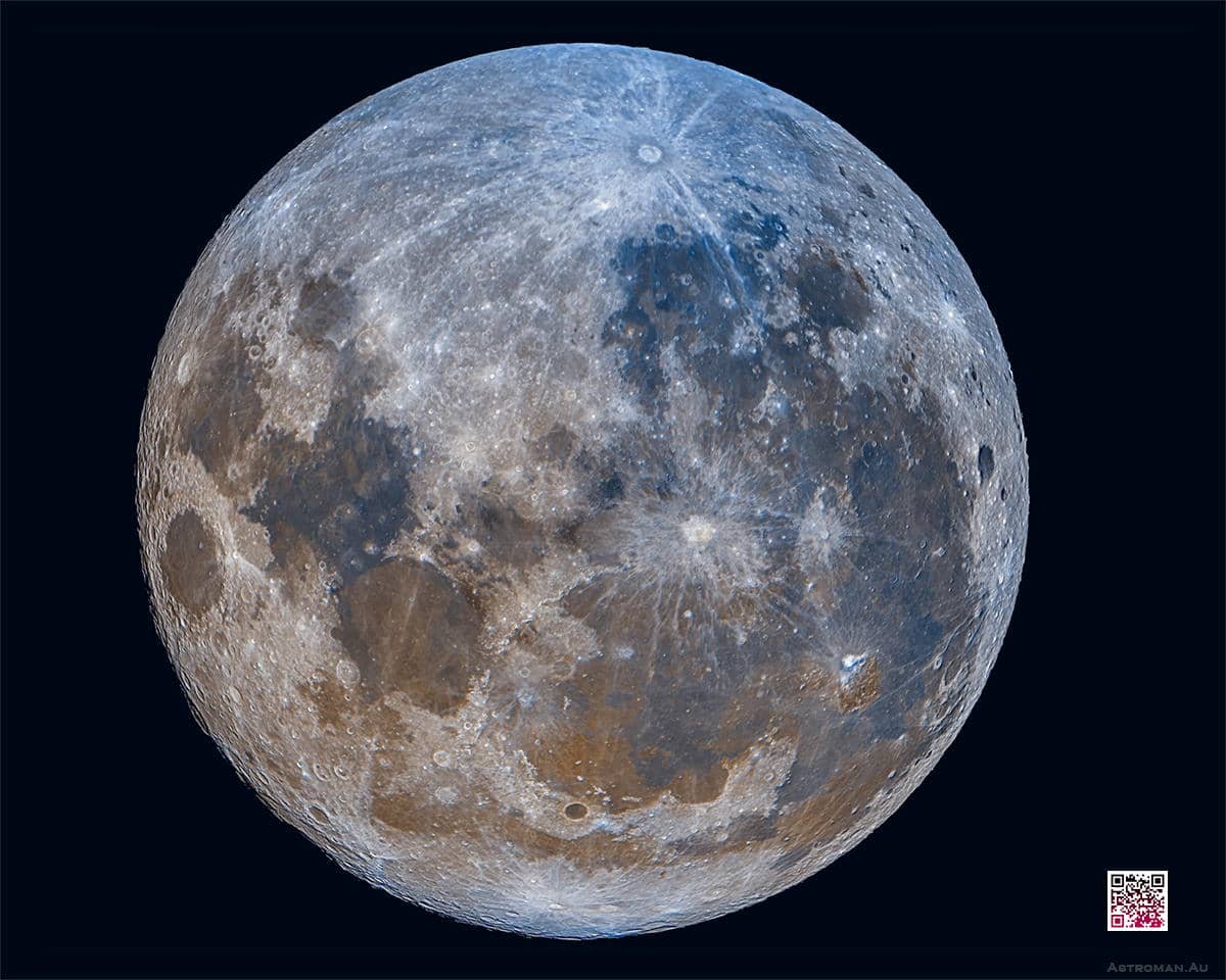 Captured with a 1.5-meter focal length telescope at the Hawthorne Deep Sky Observatory in Brisbane, this image was taken using a dedicated monochrome-cooled camera fitted with red, green, and blue filters. The photograph was assembled by recording thousands of frames per filter, selecting the highest quality 10% of frames, and combining them. By amplifying colour channel differences, we can observe these subtle surface compositions with clarity and depth.