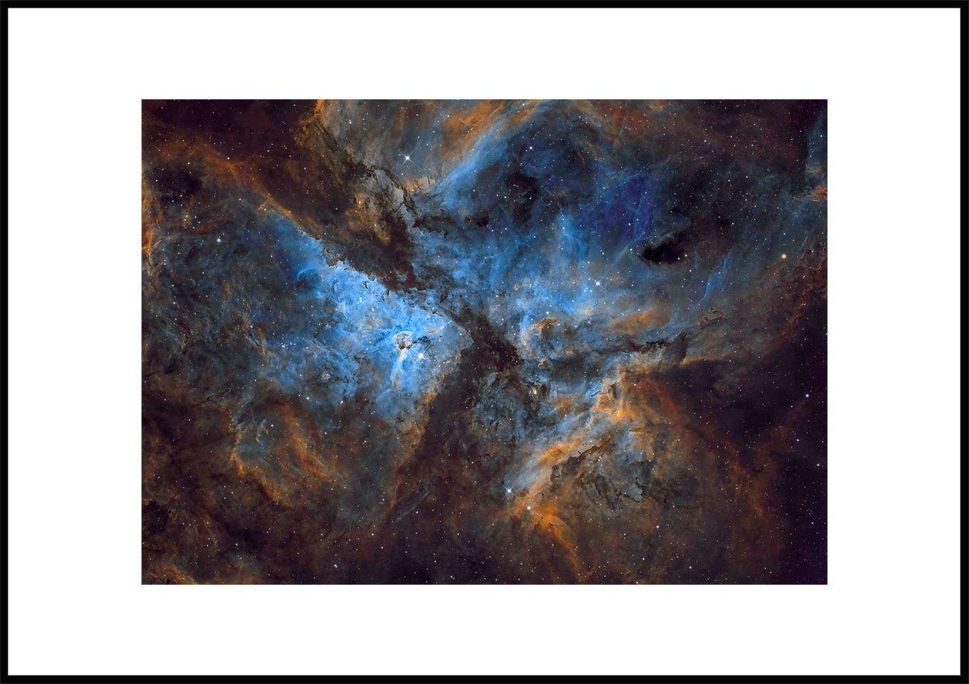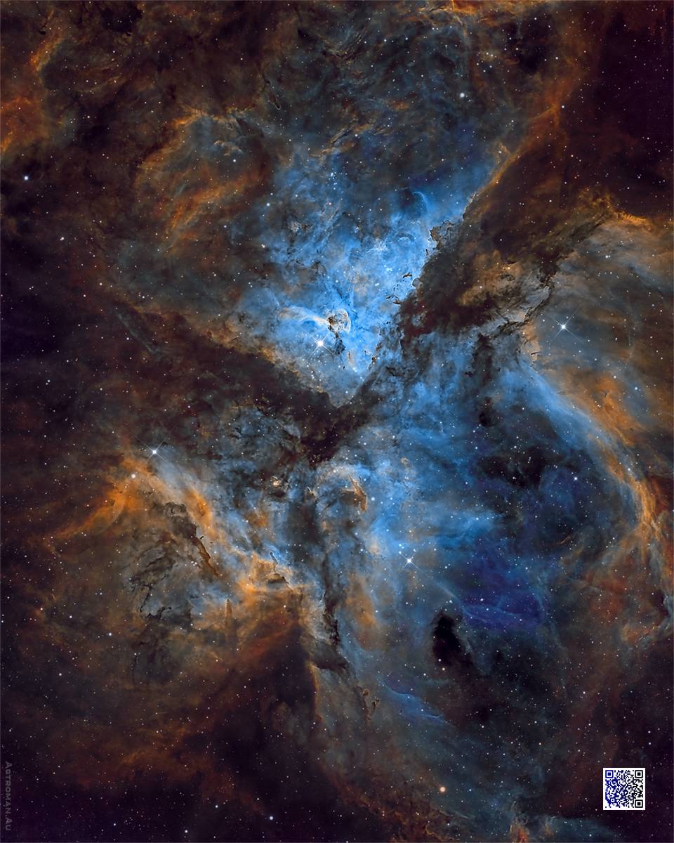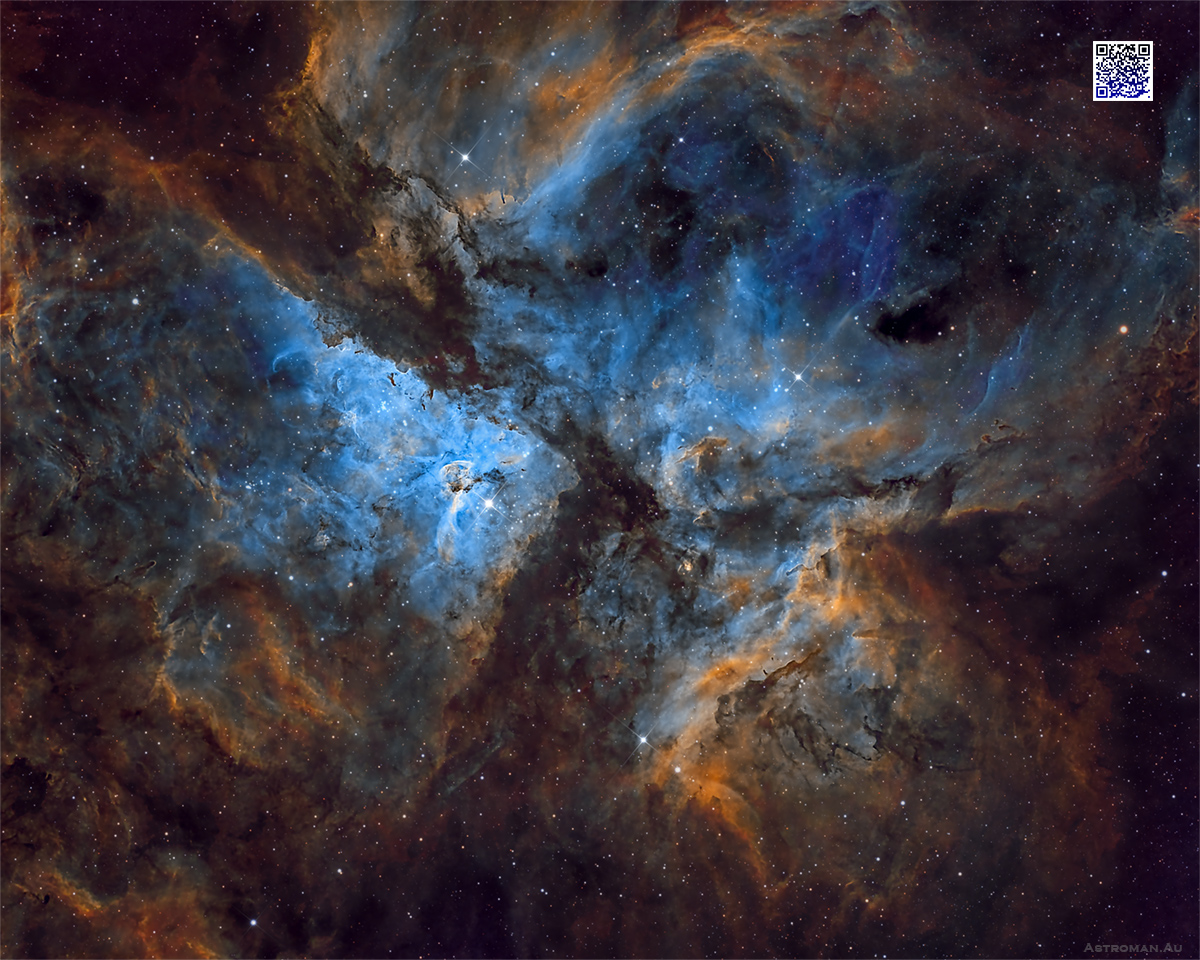 At its heart lies the enigmatic Eta Carinae, a massive and unstable stellar system expected to go supernova in the not-too-distant future (in cosmic terms). The surrounding nebula is a sculpted masterpiece of glowing ionised gas, shaped by the powerful radiation and stellar winds from young, massive stars. The intricate ridges, cavities, and filaments seen in this image are evidence of the raw forces that drive galactic evolution.
