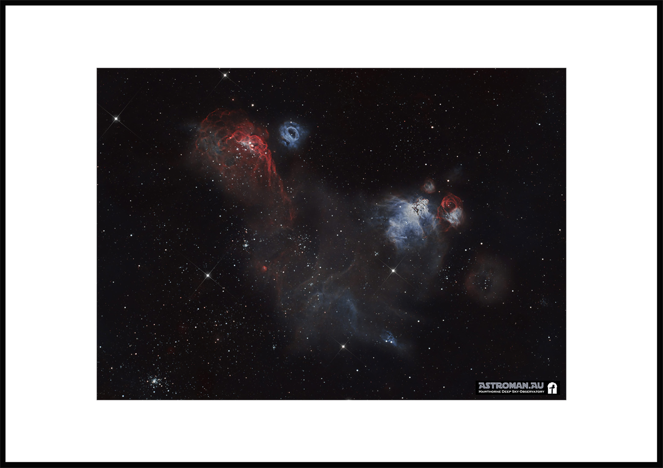 Captured with narrowband filters in high resolution, this image reveals intricate tendrils of hydrogen, oxygen, and sulphur emissions — some resembling galactic rivers and glowing filigree across the galactic canvas. While the James Webb and Hubble Space Telescopes study the LMC at microscopic levels, this composition offers a sweeping, ground-based panoramic view of this stellar powerhouse, perfect for large-format printing and display.