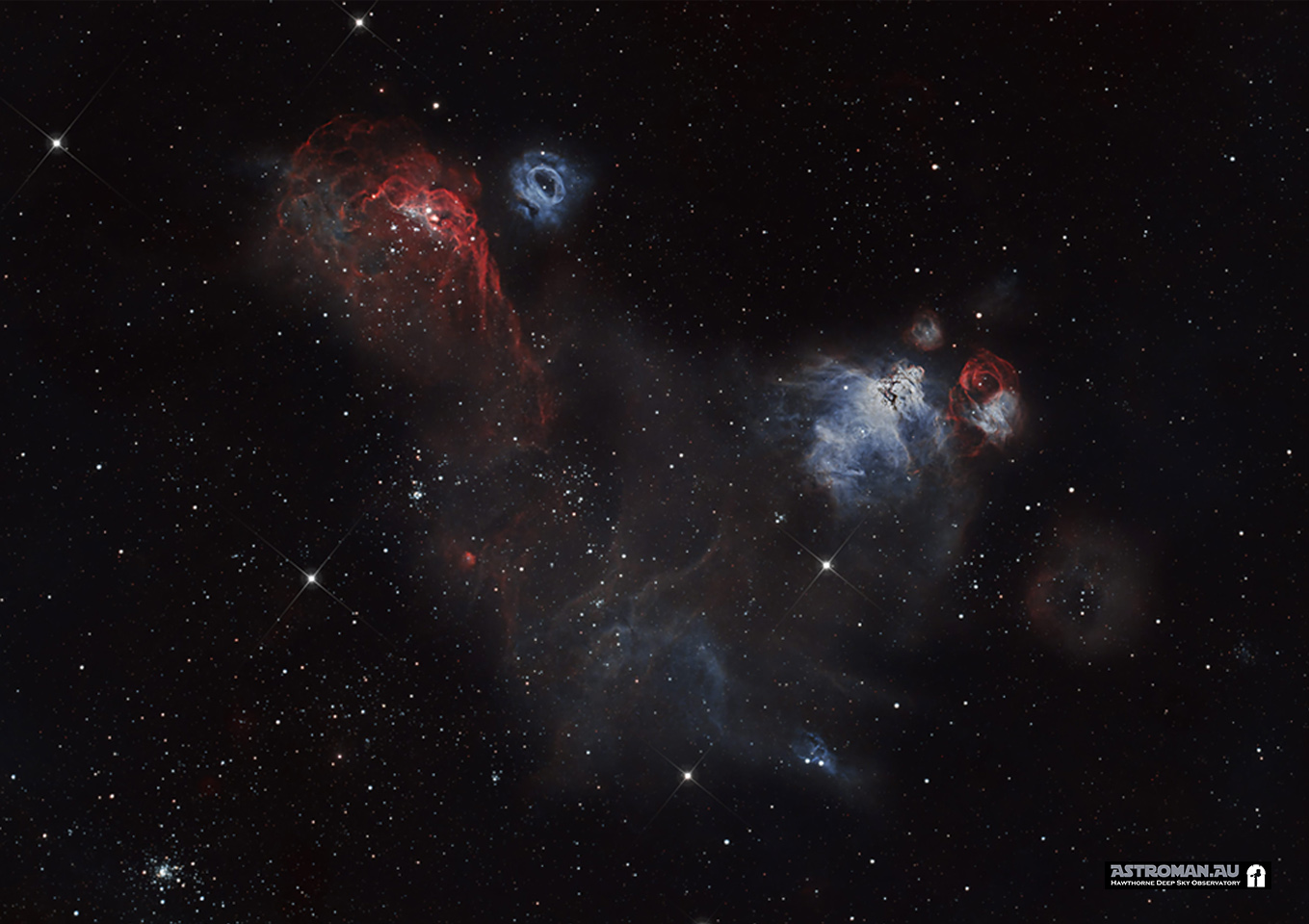This stunning wide-field astrophoto captures a rarely seen and incredibly vibrant star-forming region within our neighbouring Large Magellanic Cloud (LMC) — a satellite galaxy of the Milky Way located about 160,000 light-years away. At the heart of this cosmic portrait lie NGC 1914 and NGC 1920, two glowing nebulae surrounded by a complex tapestry of ionised gas, young stars, and dark interstellar dust.