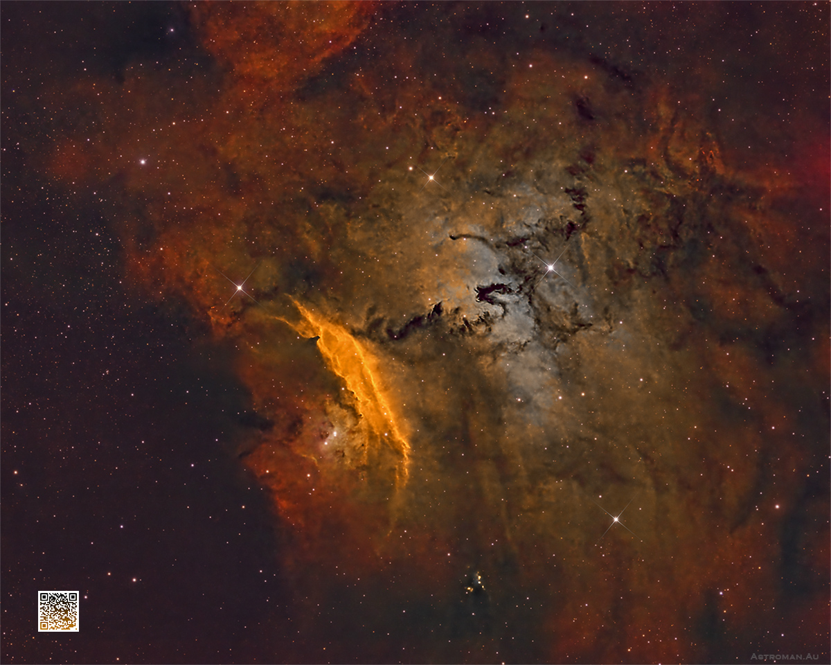 At approximately 5,000 light-years away, this compact emission and reflection nebula complex reveals the intricate processes of stellar birth, where radiation from young, hot stars energises surrounding hydrogen gas, causing it to emit the vivid reds seen in this image. The contrast between bright emission zones and dark dust lanes gives this region a dramatic, almost abstract appearance—like a cosmic painting rendered by the universe itself.