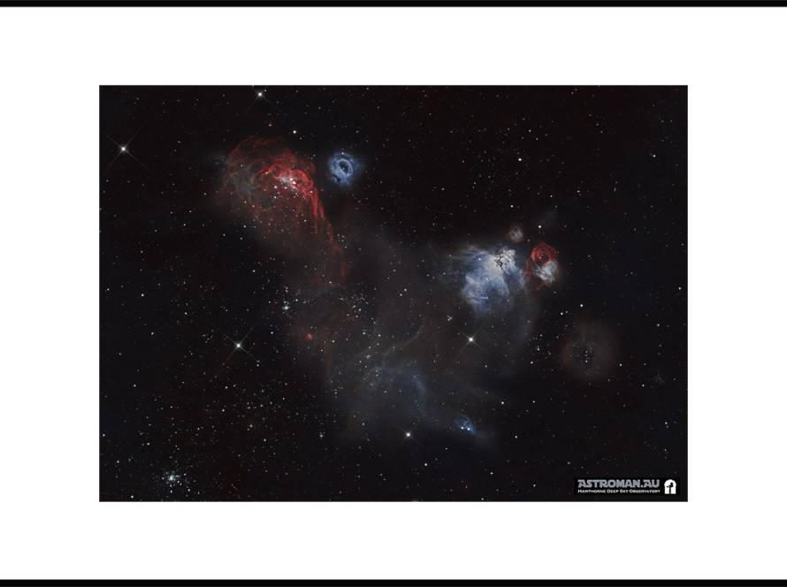 Captured using high-definition imaging equipment and narrowband filters, this photograph isolates the nebula’s structure and highlights the fine details hidden within. The subtle blues of reflection nebulae, deep reds of ionized hydrogen, and the delicate webs of dust give the image a unique three-dimensional depth rarely seen in widefield astrophotography.