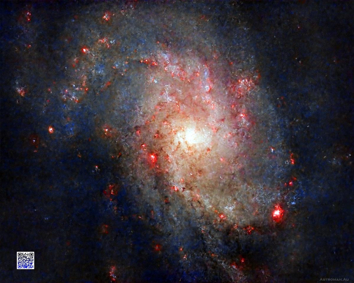 M33 is renowned for its high concentration of H II regions, which are vast clouds of ionised hydrogen gas where new stars are born. These nebulae, seen as reddish-pink patches scattered throughout the galaxy’s spiral arms, are some of the largest stellar nurseries known. The brightest of these, NGC 604, is one of the most massive star-forming regions in our Local Group, spanning nearly 1,500 light-years—over 40 times the size of the Orion Nebula! The combination of brilliant blue star clusters, glowing red hydrogen regions, and dusty spiral arms creates a mesmerizing celestial tapestry.